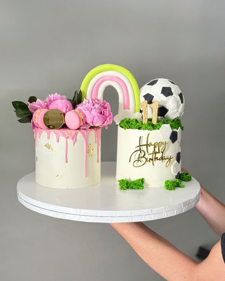 One side is dappled with beautiful pink flowers and macarons, plus a super bright rainbow topper for that sweet touch. The other side is game time ready with a soccer ball, turf frosting and a golden number.