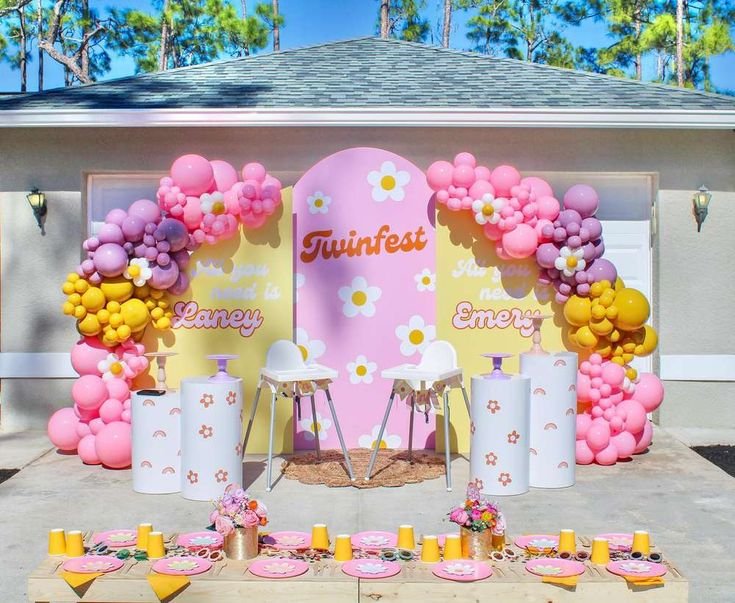 This vibrant “Twinfest” theme is a groovy choice for twins birthday party themes. Bright pinks and yellows create a playful, retro aesthetic for Laney and Emery.