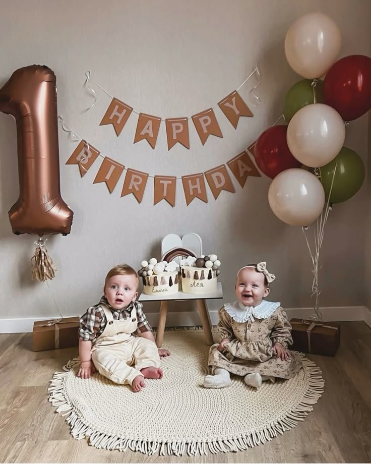 Serve up a set of individual smash cakes to your sweet duo, complete with personalized name toppers. The matching neutral ensembles are so dear against the rich colour scheme. This theme guarantees beautiful photos and a first birthday to remember.