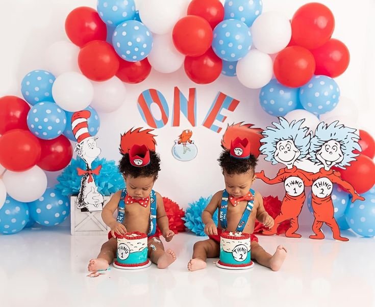 This vibrant setup is a classic among twins birthday party themes. The red, white, and blue balloon arch frames a whimsical Dr. Seuss backdrop.