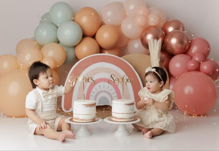 Dressing the babies in coordinating vintage-style outfits adds a delightful touch. This setup focuses on the children, creating lovely and memorable first birthday photographs.