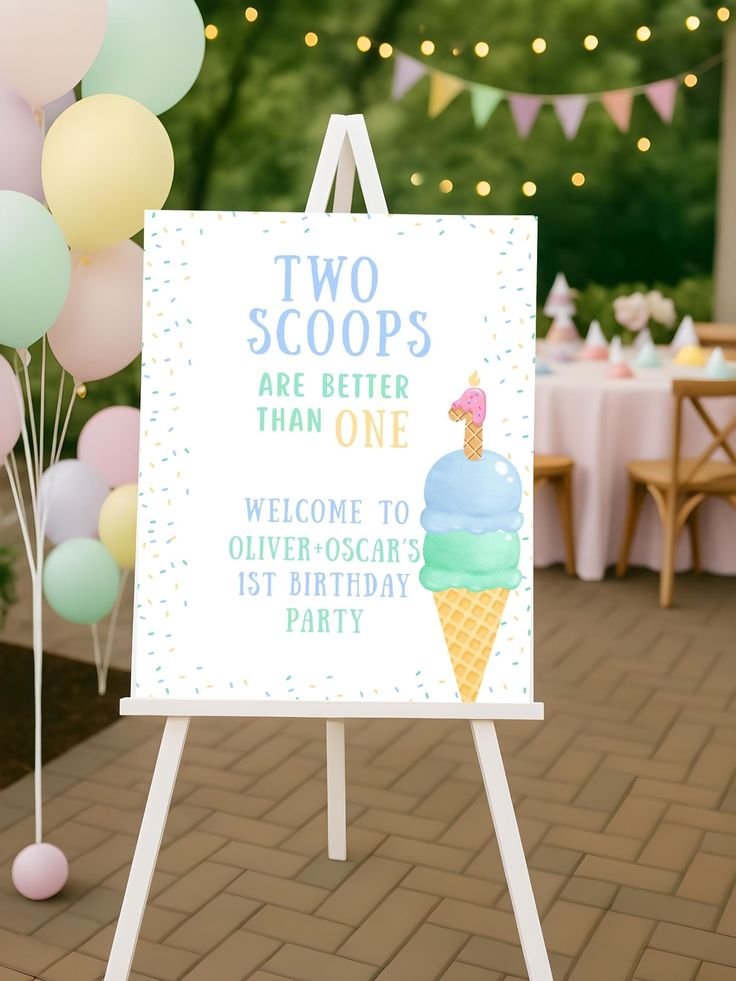 This charming sign introduces one of the sweetest twins birthday party themes. The playful message, “Two Scoops Are Better Than One,” is truly engaging.