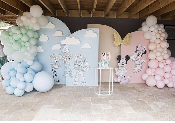 Toy Story character cutouts adorn the boys’ side with a fun cloud backdrop. The girls space features Minnie and Mickey Mouse still keeping up the old Disney magic. Elegant balloon garlands in muted hues line the entire display.