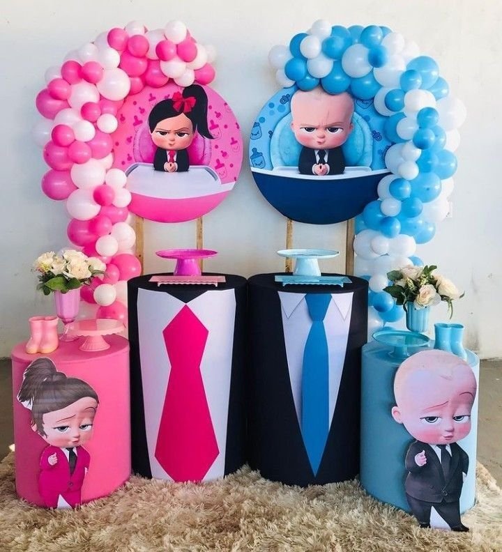 This charming scene sets the stage for a fun twist on twins birthday party themes. Denoting different zones, bright pink and clear blue balloon arches frame each Boss Baby character.