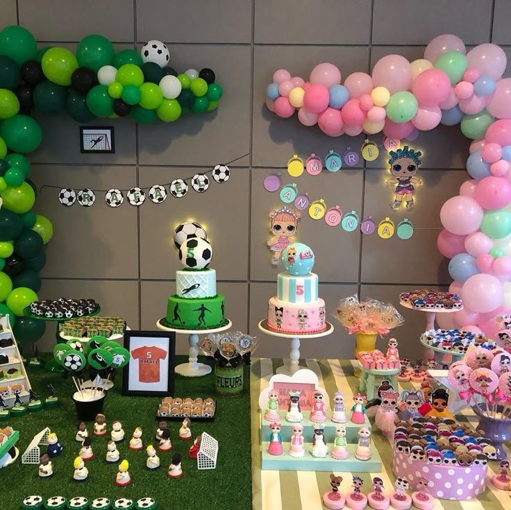 Here is a fun idea for twin birthday party themes. On one side a green, lush soccer field with themed cakes and treats for the sporty twin.