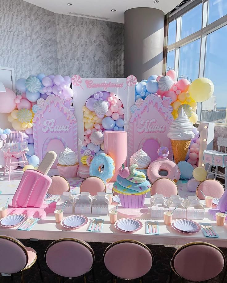 The sweet candyland display is one of the funniest twins birthday party themes. Giant pastel candies and a bright balloon arch make for an incredibly whimsical scene.