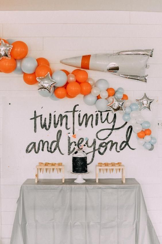 This fun space themed party is one of the top twins birthday themes. The spectacular “Twinfinity and Beyond” cosmic parents lettering adds a one-of-a-kind Zing!