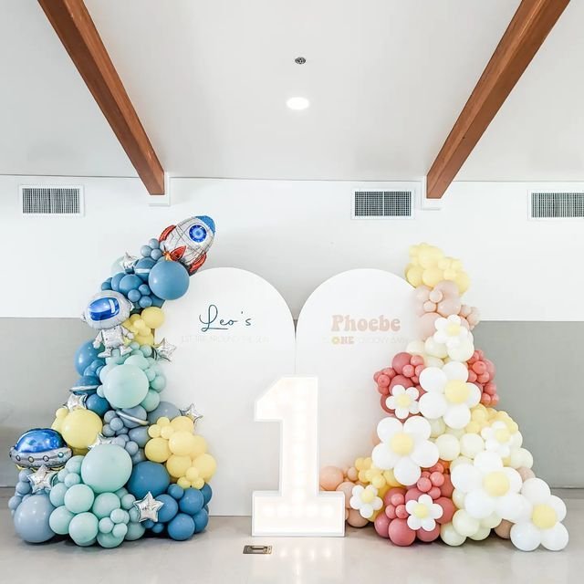 This setup beautifully showcases distinct twins birthday party themes side by side. Leo’s space side features blue and yellow balloons with rockets and astronaut foils.