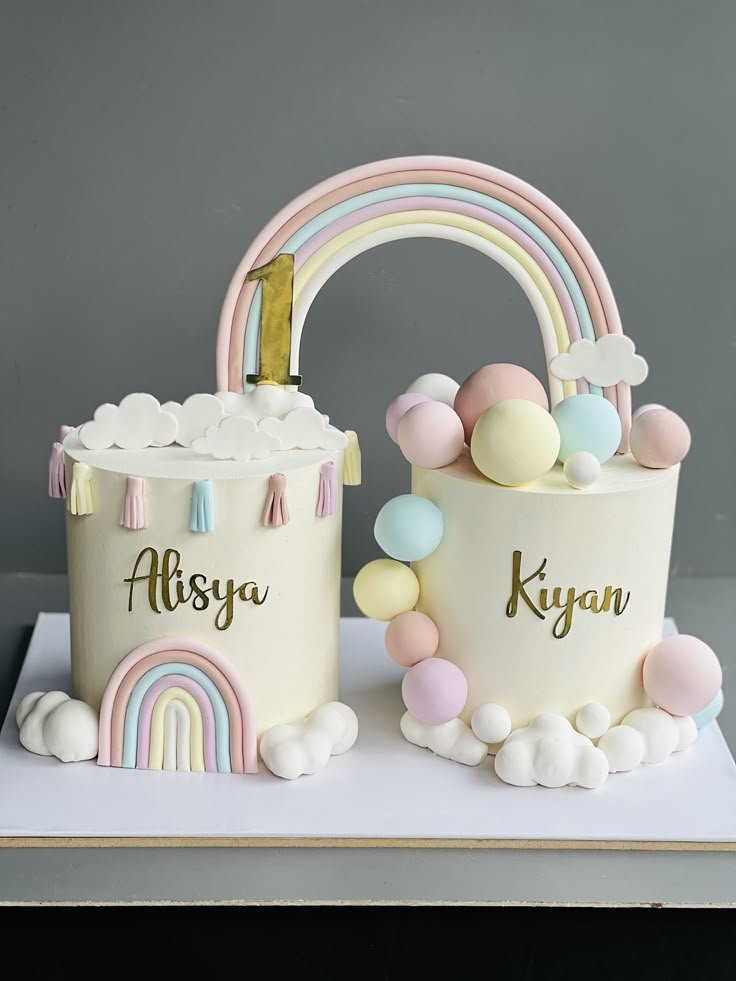 The individual designs feature soft clouds, golden name plaques, and unique accents. Alisya’s cake includes playful tassels while Kiyan’s has fun pastel spheres.