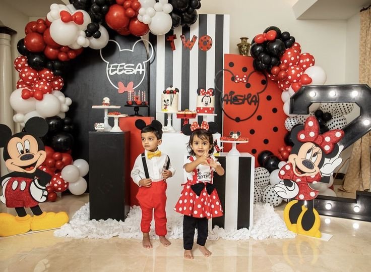 This vibrant, classic setup features beloved Mickey and Minnie for great twins birthday party themes. Bold red, black, and white colors create a visually stunning backdrop for Eesa and Aisha.