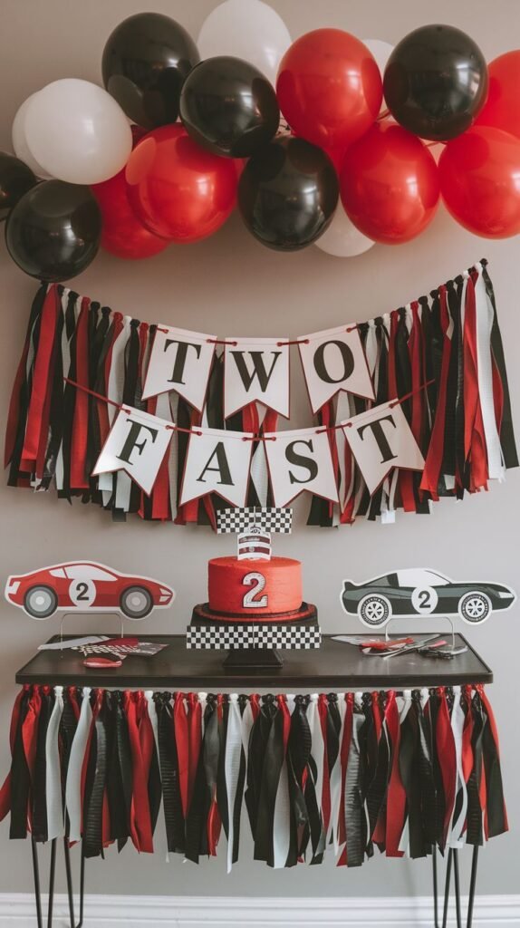 Set the stage for an exciting “Two Fast” birthday with this vibrant racing themed party station. A bold “Two Fast” banner, accented with red and black streamers, takes center stage, creating an instant focal point. Red, black, and white balloons float above, adding to the festive atmosphere.