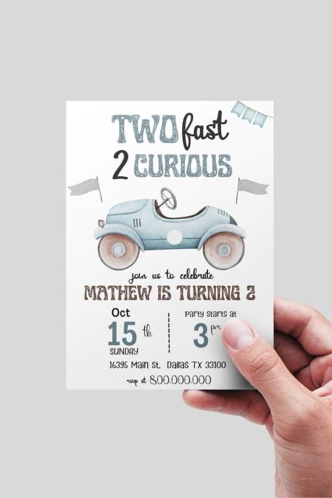 Invite guests to a special “Two Fast” birthday with this charming invitation, setting a playful tone. The card features a whimsical blue vintage race car, hinting at the speedy fun to come. “Two Fast 2 Curious” is prominently displayed, capturing the essence of a two-year-old’s vibrant energy.