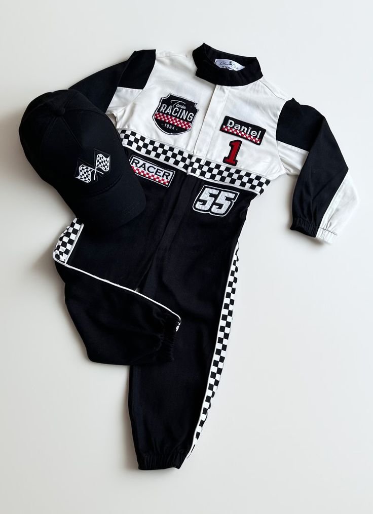 The matching black cap features embroidered checkered flags, completing the authentic racer look. This outfit is not only fantastic for a birthday party but also a fun option for dress-up or even a charming Halloween costume. It’s comfortable and stylish for active toddlers.
