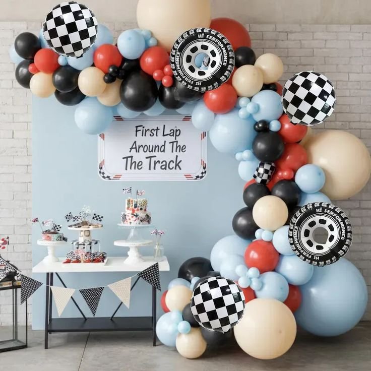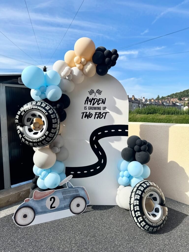 A dynamic balloon garland in a mix of light blue, black, white, and cream cascades along one side, accented by cool tire-shaped balloons. A charming race car cutout, marked with the number “2,” sits at the base, ready for action.