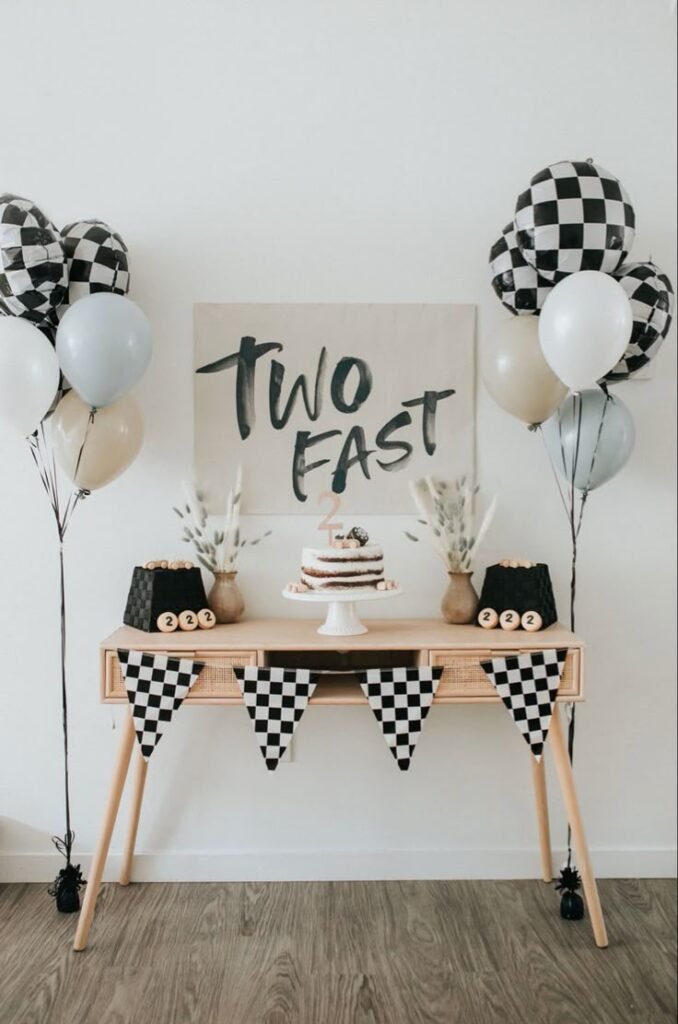 Set up a chic and engaging “Two Fast” dessert station with this beautifully styled setup. A striking “Two Fast” sign in a modern script forms the backdrop, creating an instant focal point. Clusters of checkered, white, and neutral-toned balloons frame the table, enhancing the racing theme.