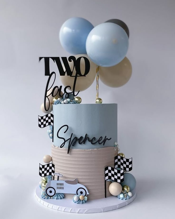 Celebrate a “Two Fast” birthday with this elegantly designed two-tiered cake. The top tier features a smooth light blue frosting, while the bottom boasts a textured beige finish, creating a sophisticated contrast. A striking “Two Fast” topper and personalized “Spencer” lettering make it truly special.
