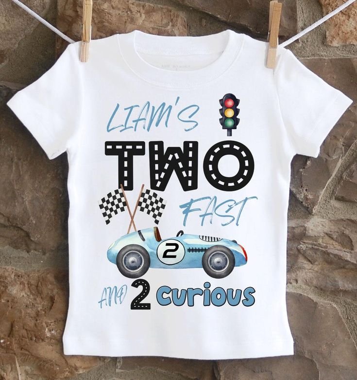 Dress your little one in style for their “Two Fast” birthday with this adorable personalized t-shirt. The crisp white tee features bold “Liam’s Two Fast” lettering, cleverly integrating a tire track design into the “O”s. A cute blue vintage race car, marked with the number “2,” adds a playful touch.