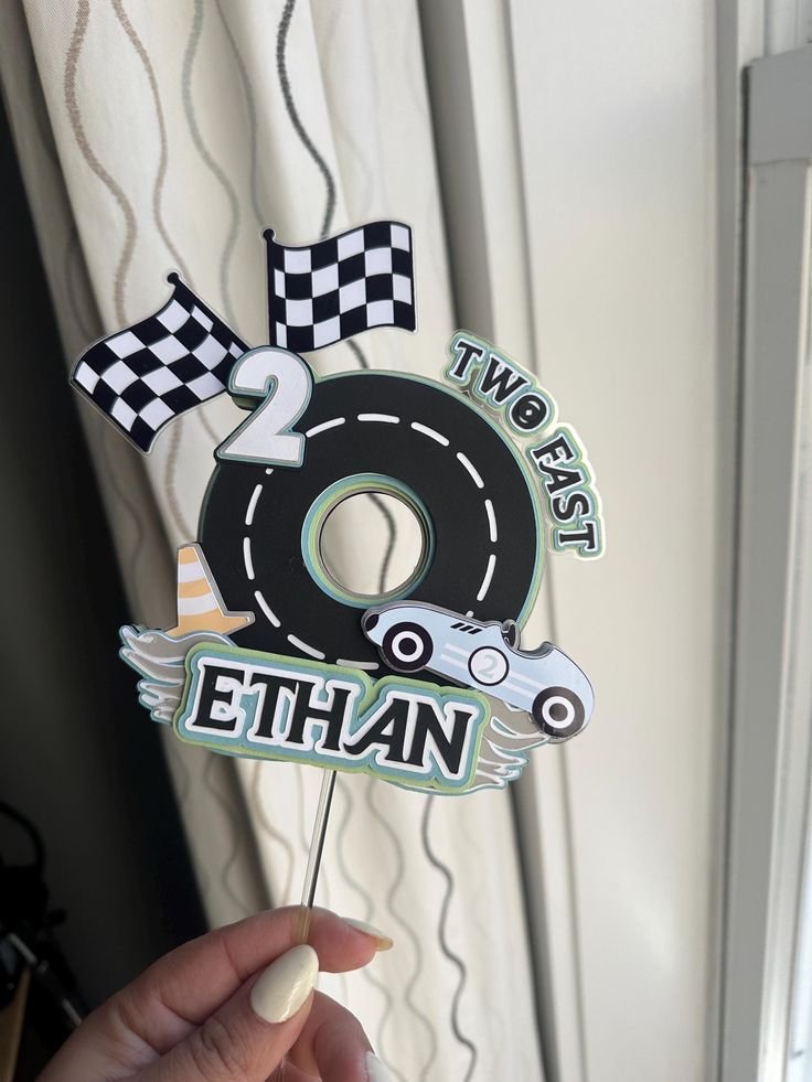 The topper also includes the festive “Two Fast” lettering, along with a personalized touch, displaying “Ethan” in bold, playful letters. A small traffic cone adds another fun detail, perfectly tying into the high-speed theme. This accessory will surely make your cake stand out.