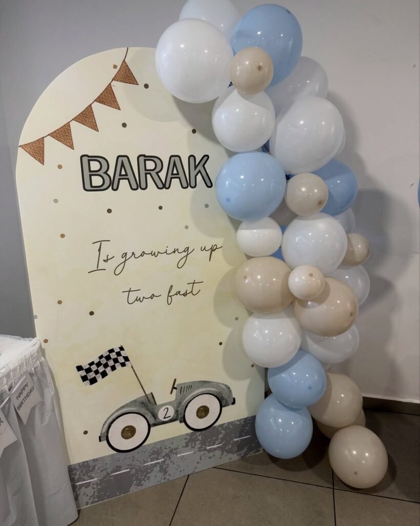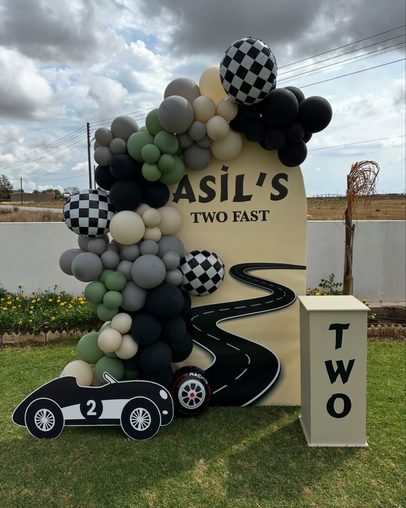 Prepare for an exciting “Two Fast” celebration with this striking outdoor setup. A tall, cream-colored backdrop boldly announces “Asil’s Two Fast,” featuring a winding road design. Alongside, a stylish display stand spells out “Two,” adding a clever numerical touch.