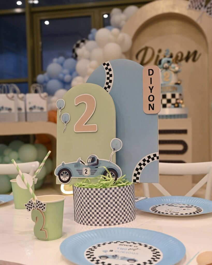 This charming centerpiece is an effortless way to enhance your “Two Fast” themed birthday decor. It adds a touch of playful elegance to each table, ensuring a cohesive and memorable celebration for all guests.