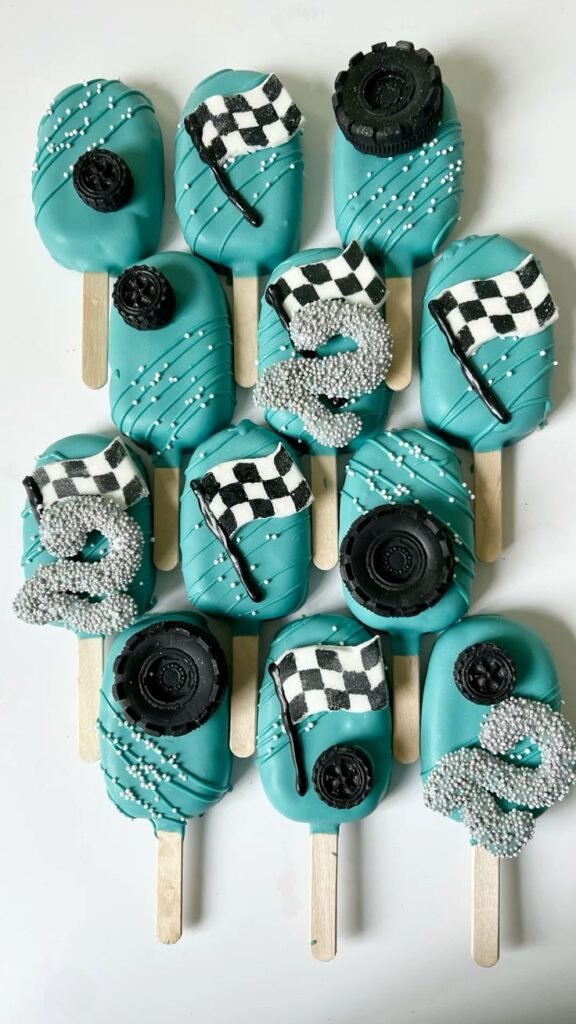 Some cakesicles are adorned with charming checkered flags, while others feature edible tire accents or playful white sprinkles. A few even showcase a shimmering silver number “2” made from sprinkles, perfectly tying into a second birthday celebration. Each detail is thoughtfully crafted.