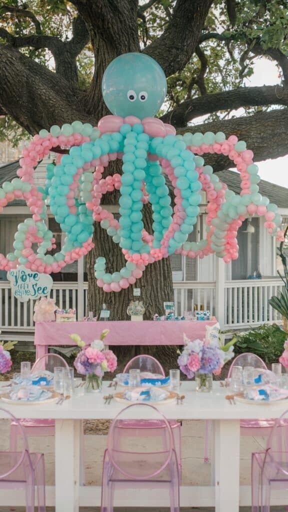 This spectacular under the sea birthday party features a massive octopus balloon centerpiece. It hangs from a tree, creating a whimsical and grand entrance. Its long, twisting tentacles are made of pink and blue balloons.