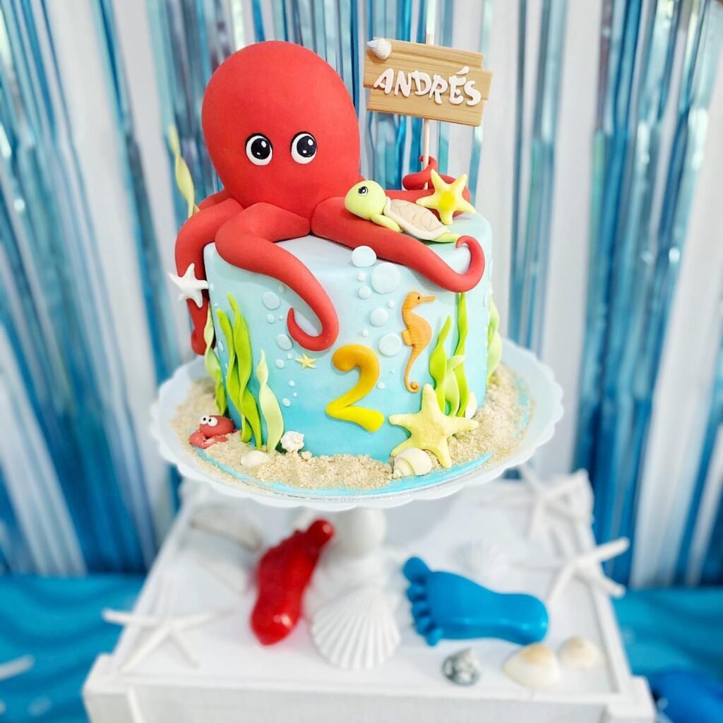 This adorable cake is a highlight for an under the sea birthday party. A cheerful red octopus with big, friendly eyes sits on top. A small turtle and starfish join it.