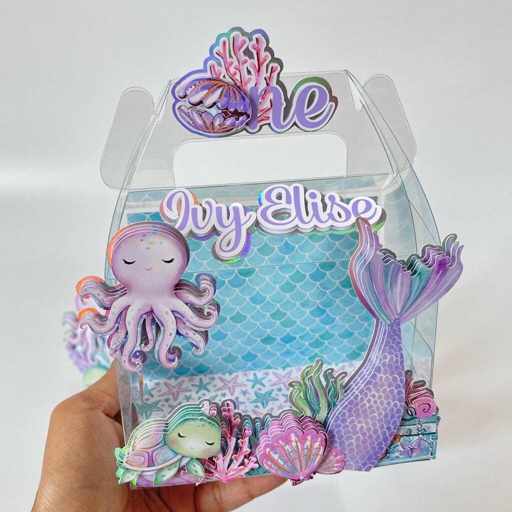 Each one features a custom name tag and a fun mermaid tail. The clear boxes showcase the delightful sea-themed decorations.
