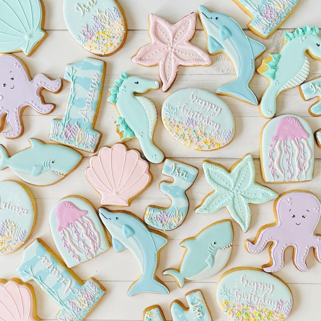 The treats are shaped like smiling dolphins, friendly sharks, and cute seahorses. Some cookies are even personalized with the name and age of the birthday child.