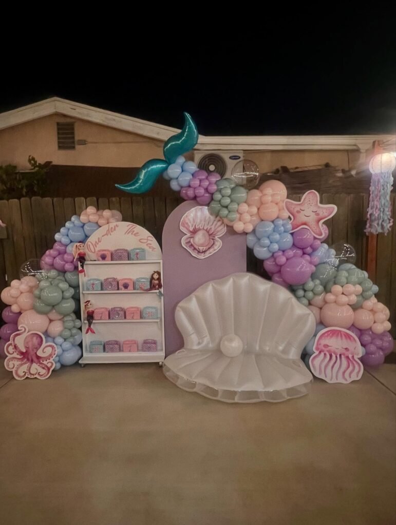 Soft pastel balloons in various sizes create a beautiful arch. It is adorned with a mermaid tail, starfish, and jellyfish cutouts. It’s a whimsical backdrop for photos.