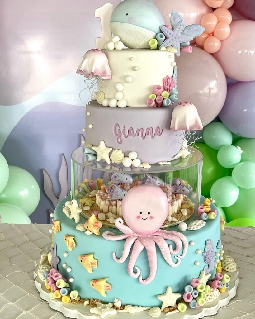 The middle tier, with a clear design, shows off an adorable octopus and colorful fish. The bottom tier features sculpted coral, shells, and starfish.