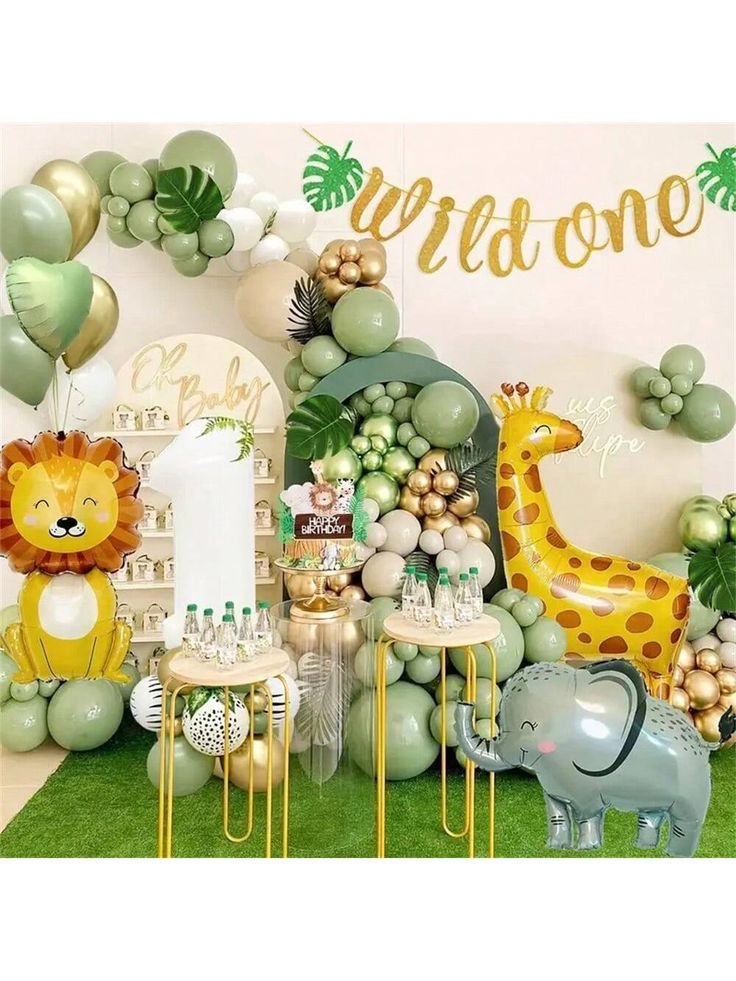 The backdrop features a lush, earthy balloon arch in shades of green, gold, and white. This natural color scheme creates a calming and cozy atmosphere. The greenery and textures add to the genuine safari feel.