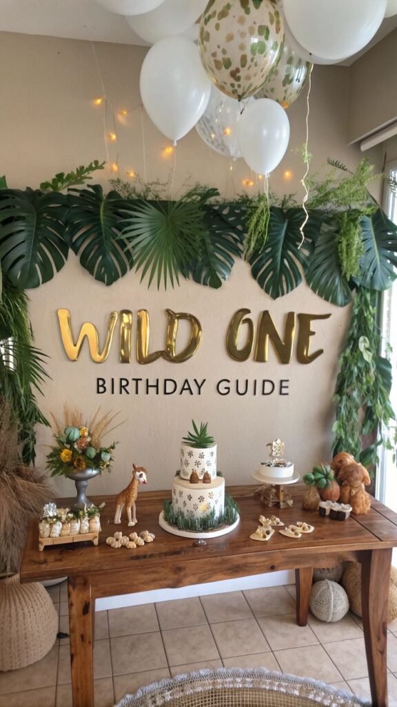 This beautifully styled table is a focal point for a wild one birthday party boys celebration. Giant golden “Wild One” balloons set the tone against a backdrop of lush green leaves. It’s an inviting and sophisticated party setup.