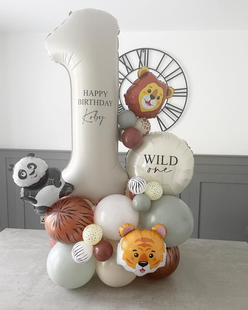 This adorable balloon bouquet is a great centerpiece for a wild one birthday party boys theme. A big, white number one balloon with the birthday boy’s name stands tall, making a clear statement about the special milestone. It’s a wonderful way to honor the first birthday.