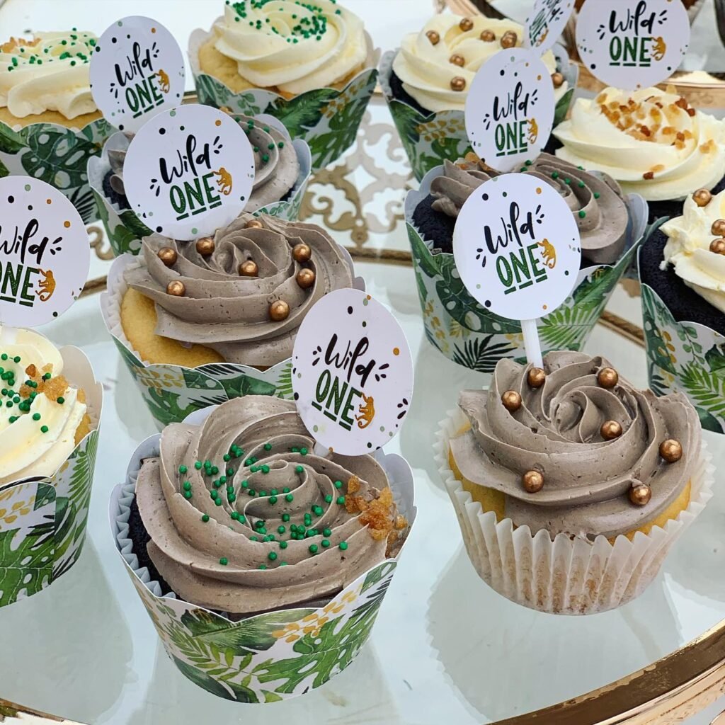 These delicious cupcakes are the perfect sweet treat for a wild one birthday party boys theme. Each one is topped with either green or brown frosting, sprinkles, and a custom “Wild One” tag. The palm-leaf wrappers add a perfect jungle touch.