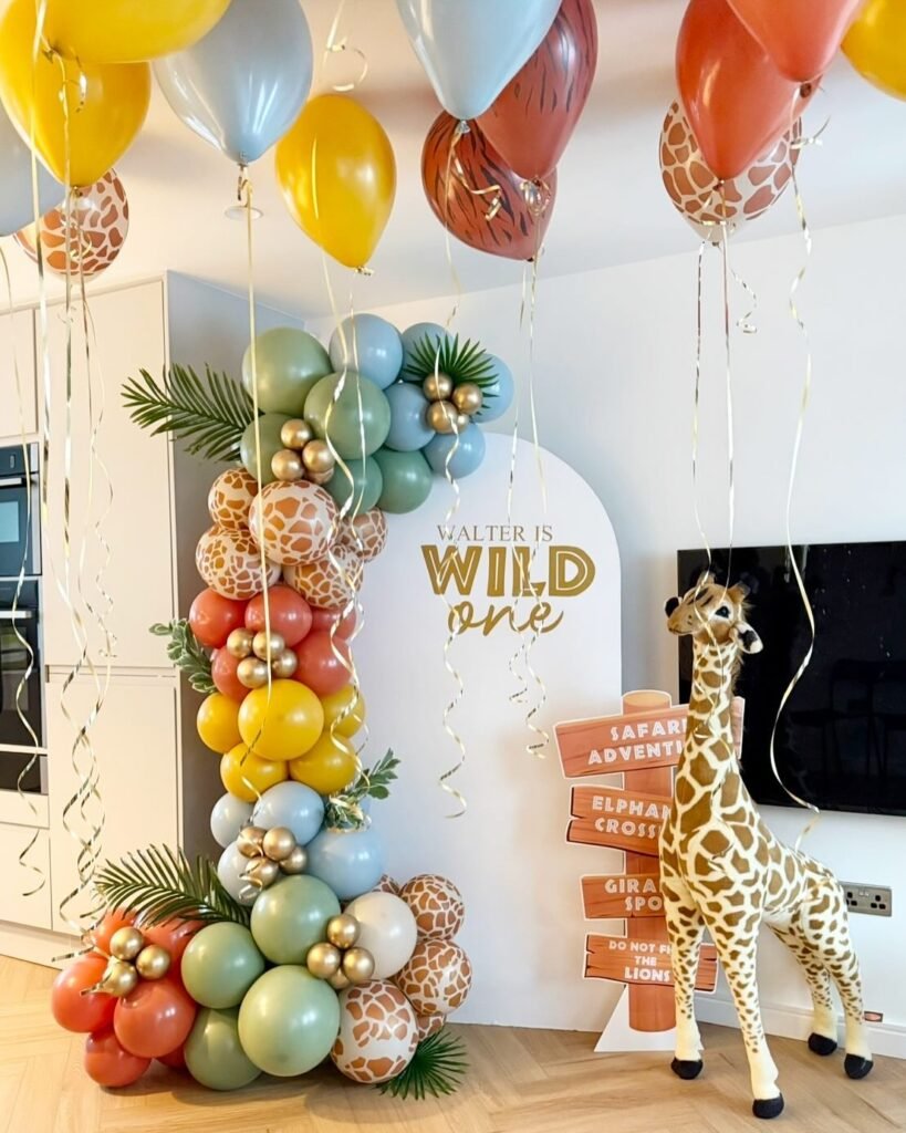 This beautiful party backdrop is a showstopper for a wild one birthday party boys theme. The stunning balloon arch combines shades of blue, green, and brown with animal-print balloons. The wooden crates and a safari signpost add to the adventurous feel.