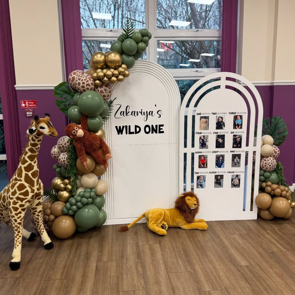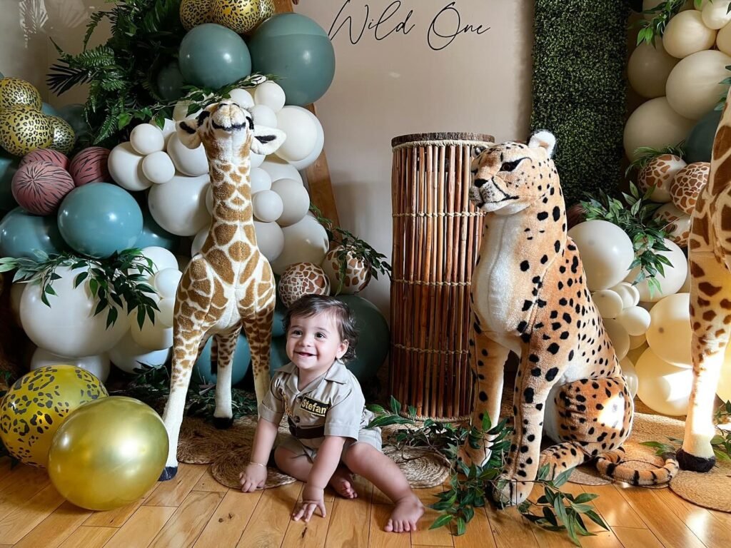 This charming photo spot captures the heart of a wild one birthday party boys theme. The birthday boy sits among large, lifelike stuffed animals, a giraffe and a cheetah. He’s dressed like a little explorer, ready for his big adventure.