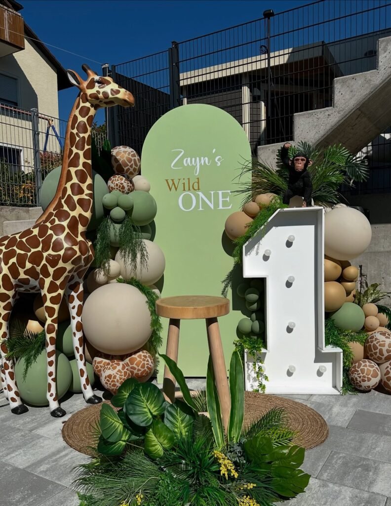 A personalized “Wild One” sign in a rustic font sits at the center, ready for the birthday boy. A tall giraffe and jungle greenery complete the scene. It is an ideal spot for guests to take incredible photos.