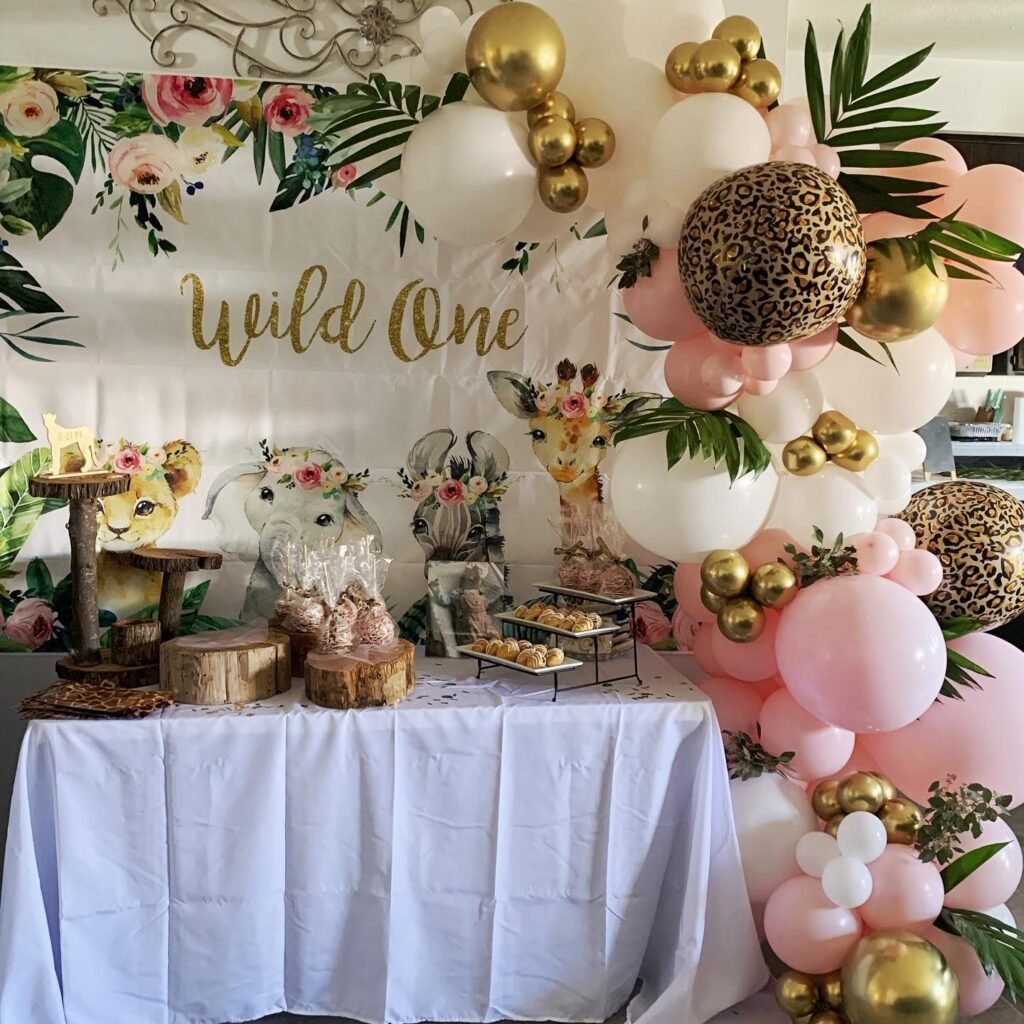 A balloon arch with white, gold, pink, and leopard-print balloons adds a touch of glam. On the table, rustic wood slices hold adorable animal-themed treats. This party theme is a great mix of wild and elegant.
