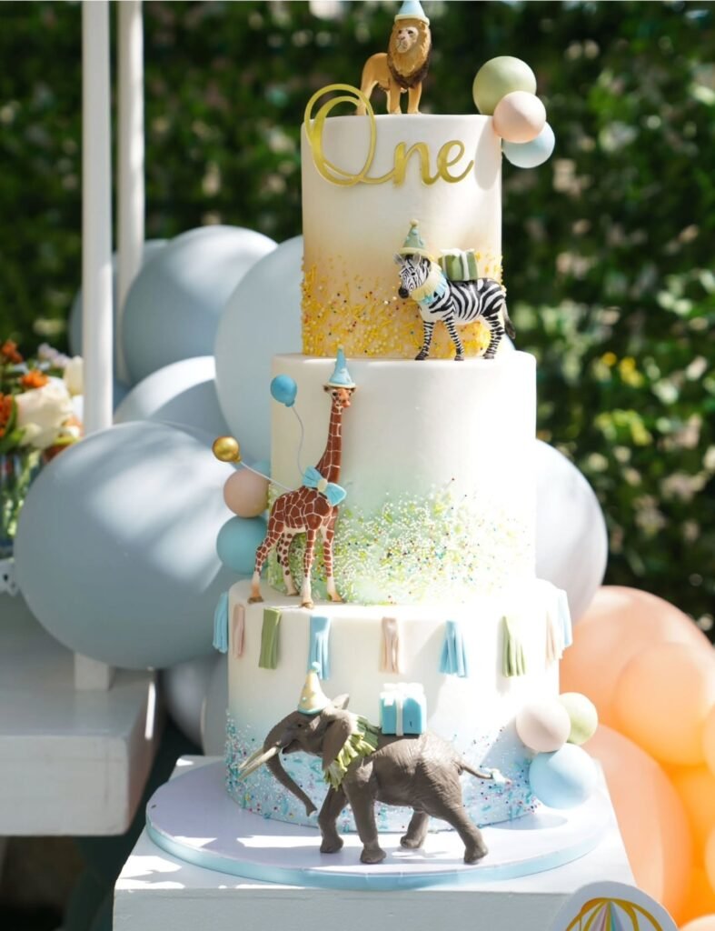 This incredible tiered cake is the star of any wild one birthday party boys celebration. Each layer is decorated with cute safari animals wearing tiny party hats, ready to celebrate. The subtle blue and gold sprinkles add a magical touch.