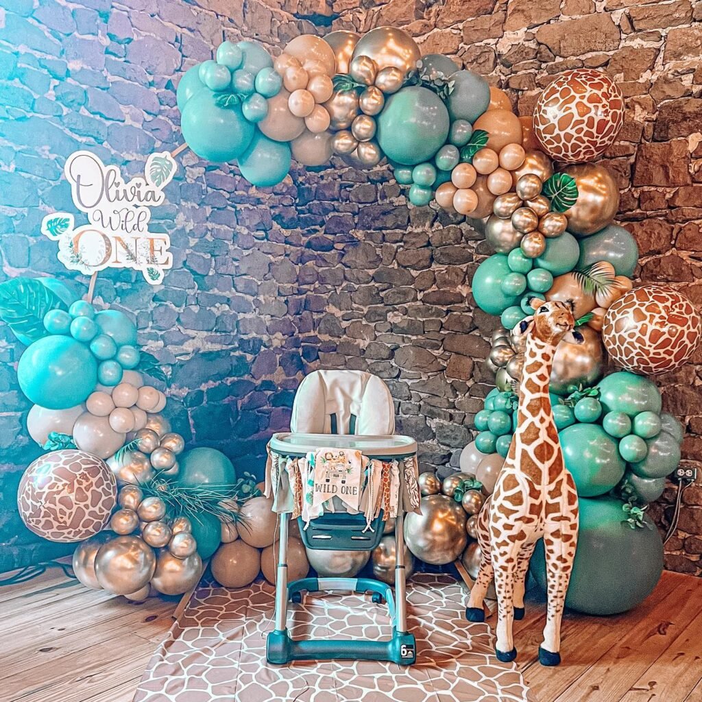 This high-chair setup is perfect for the main event of a wild one birthday party boys celebration. The backdrop features a striking balloon arch in a mix of soft blues, golds, and giraffe-print balloons. It’s a fantastic spot for a cake smash.