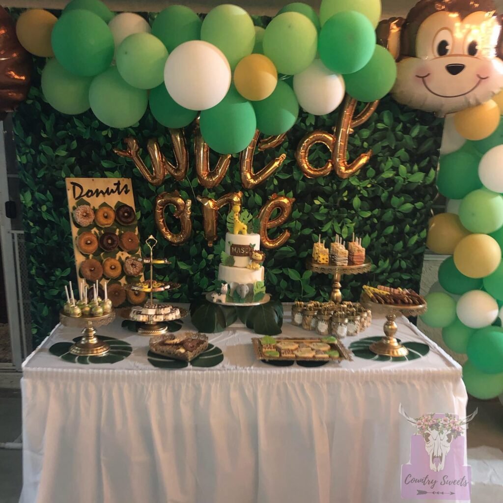 This dessert table is a perfect centerpiece for a wild one birthday party boys theme. A lush green leaf backdrop and balloon arch create a jungle setting. The golden “Wild One” balloons shine brightly, highlighting the theme.