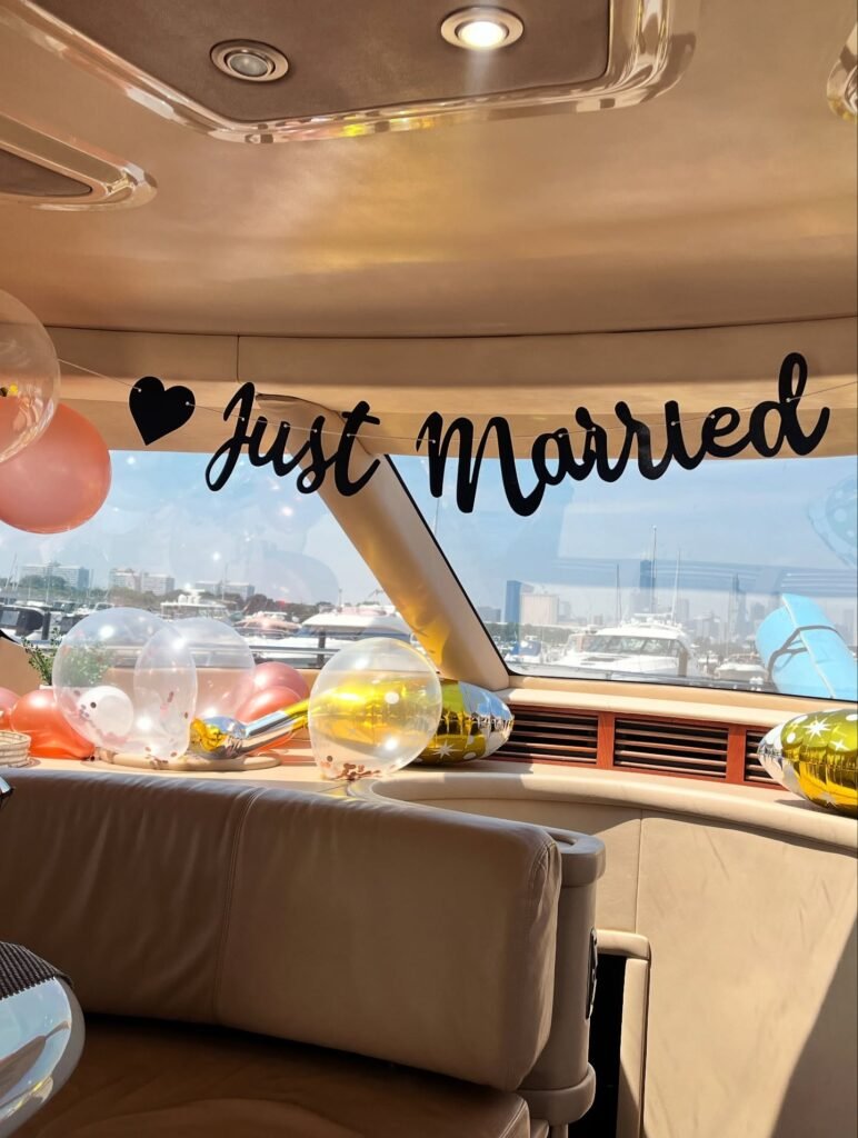 The “Just Married” banner becomes even more meaningful when it’s framed by ocean views and gentle sea breezes. Balloon arrangements in soft pastels complement the maritime setting beautifully, while the natural lighting from panoramic windows creates the perfect romantic glow.