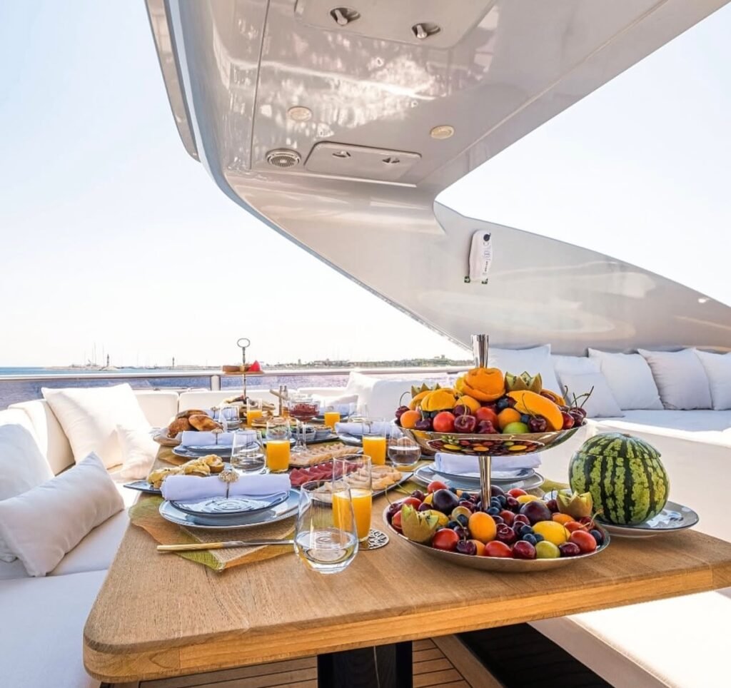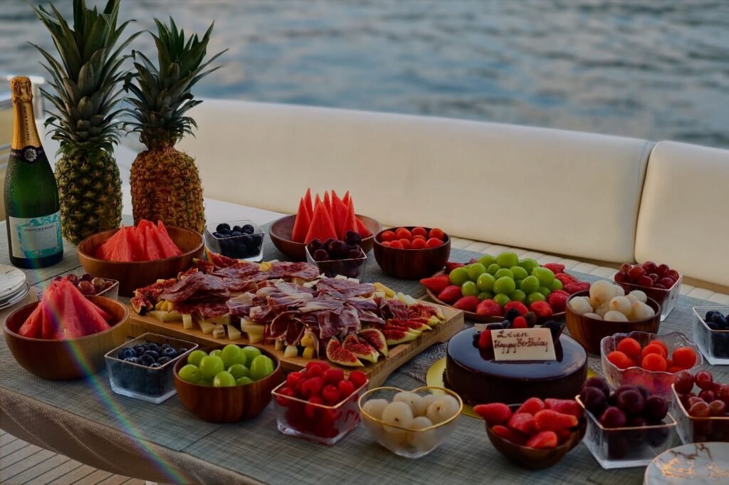 Nothing beats starting your yacht celebration with a sophisticated brunch spread. Picture fresh fruit platters bursting with seasonal favorites, artisanal pastries, and refreshing orange juice served in crystal glasses.