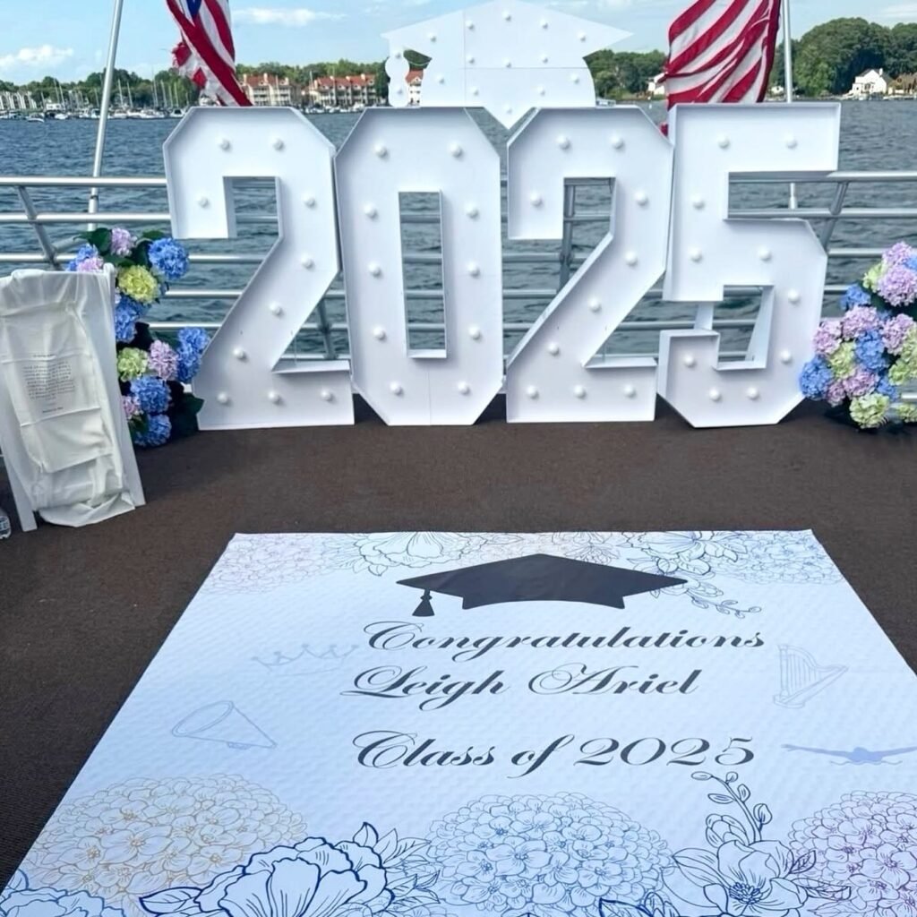 Celebrate academic achievements in style with a sophisticated yacht graduation party. Large illuminated numbers marking the graduation year create a stunning focal point against the water’s backdrop.