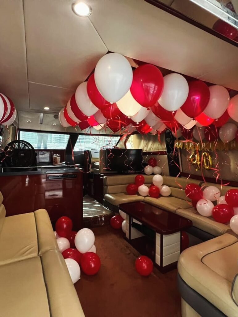 Sometimes the most intimate celebrations happen in smaller yacht spaces, and that’s perfectly fine! Red and white balloons clustered along the ceiling create a festive canopy effect that makes the space feel special and enclosed.