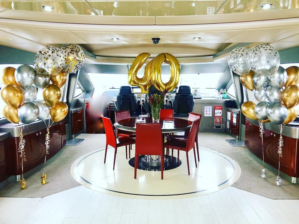 Neutral balloon clusters in metallic tones complement the yacht’s existing interior beautifully. This approach works particularly well for milestone birthdays where you want to impress.