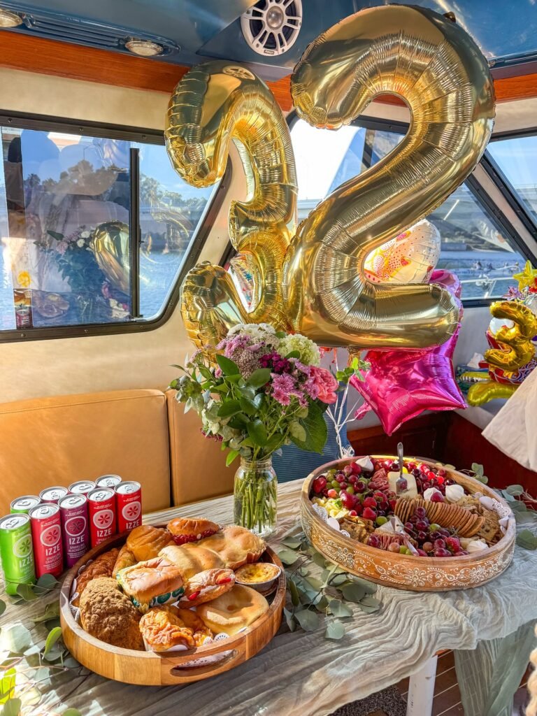 Transform your yacht into the ultimate birthday destination with eye-catching number balloons and colorful arrangements. The beauty of yacht parties lies in mixing indoor and outdoor spaces – set up a dessert station inside while keeping the main festivities on deck.