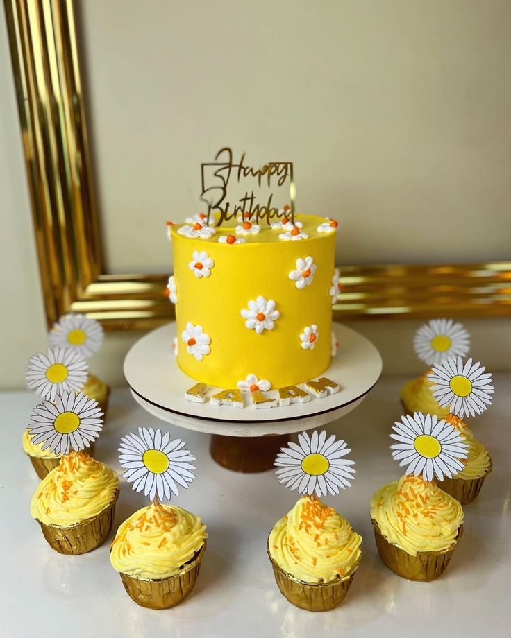 This vibrant yellow birthday cake and its matching cupcakes are covered in a cheerful daisy theme. The bold, simple design is both fun and visually appealing for a celebration.