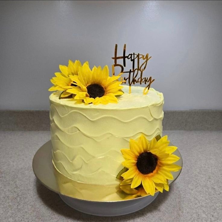 A golden “Happy Birthday” topper adds a touch of shine to the cake. This is a delightful choice for a warm and sunny birthday celebration.